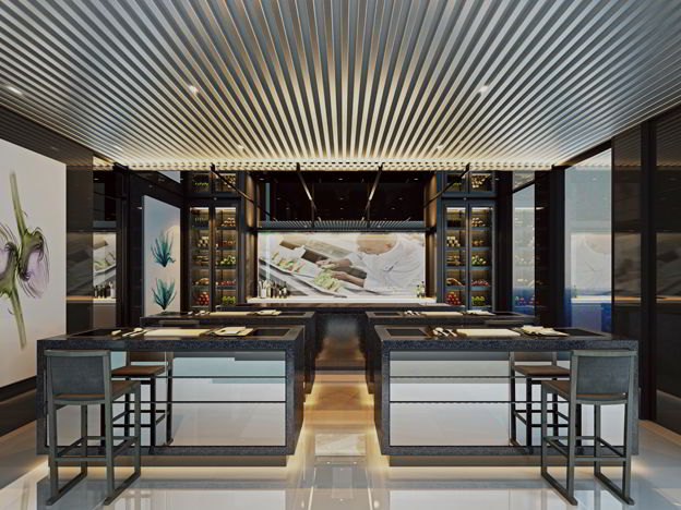 Diseñado para sumergirlo aún más en los placeres de la gastronomía, nuestro dedicado emporio de cocina le permite participar en una serie de lecciones culinarias, sostenida por expertos. Estaciones de cocina especiales, una pantalla de televisión que muestra las técnicas del chef y un jardín de hierbas hidropónicas son solo algunos de los elementos disponibles para ti, mientras creas una colección de auténticas recetas regionales. Las especialidades a bordo de los restaurantes destacan la cocina regional durante todo su crucero.  Disfrute fina cocina Francesa contemporánea, pruebe deliciosa fusión Asiática o  pruebe también el Mediterráneo en restaurantes exclusivos. Pequeños e íntimos lugares abundan en Scenic Eclipse entregándole la opción de privacidad sin costo adicional, desde nuestro Chef’s Table ofreciendo una experiencia de degustación privada para solo 8 pasajeros hasta el grill privado Teppanyaki para comida de solo 10 pasajeros.