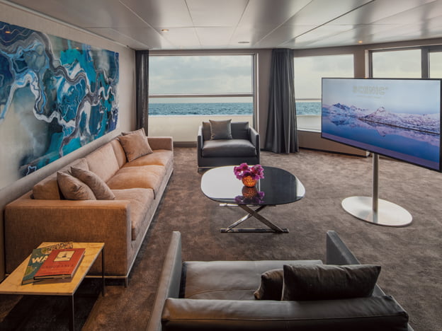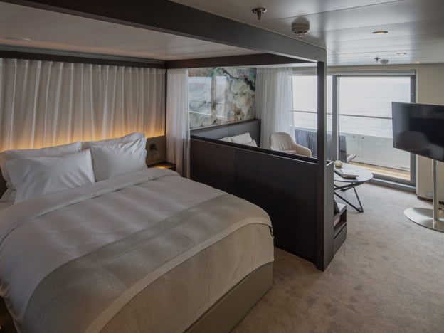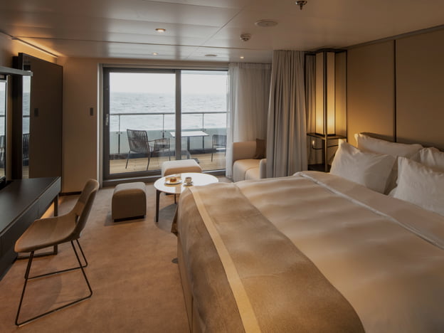 Estas habitaciones premier cuentan con una gran cantidad de características y servicios adicionales. Una íntima cena en tu Suite, personalmente entregada por tu mayordomo será un recuerdo para atesorar. Estar en cama y, con presionar suavemente un botón, acceder al mundo exterior a través de la ventana del balcón desplegable, nunca perderás una oportunidad de foto. Los pasajeros de estas habitaciones disfrutarán del privilegio de las cenas prioritarias en los restaurantes especiales como también la elección prioritaria de excursiones en tierra y experiencias de descubrimiento.  Embarque y desembarque VIP son inclusiones standard al comienzo y término de su crucero.
