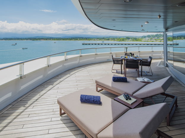 Scenic Eclipse ha sido diseñado con una plétora de áreas exteriores, desde la Terraza del Sol con vistas panorámicas hasta la Terraza Observatorio con vista al frente del yate.  Y luego está la terraza de la piscina y spa, todo lo que provee de los puntos de perfecta ventaja para ver increíbles paisajes o vida salvaje.  Le prometemos que nunca se perderá un momento.