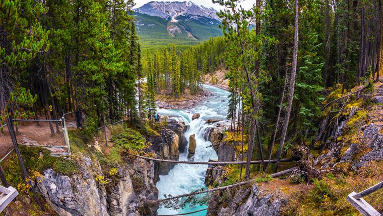 - Cascadas Athabascas: Son las cascadas más famosas del parque nacional de Jasper. Están situadas a unos 30 km al sur la ciudad de Jasper, en la intersección de la carretera 97 y la 97A. Además de las cascadas, podrás hacer un pequeño recorrido por un cañón que te llevará al río.