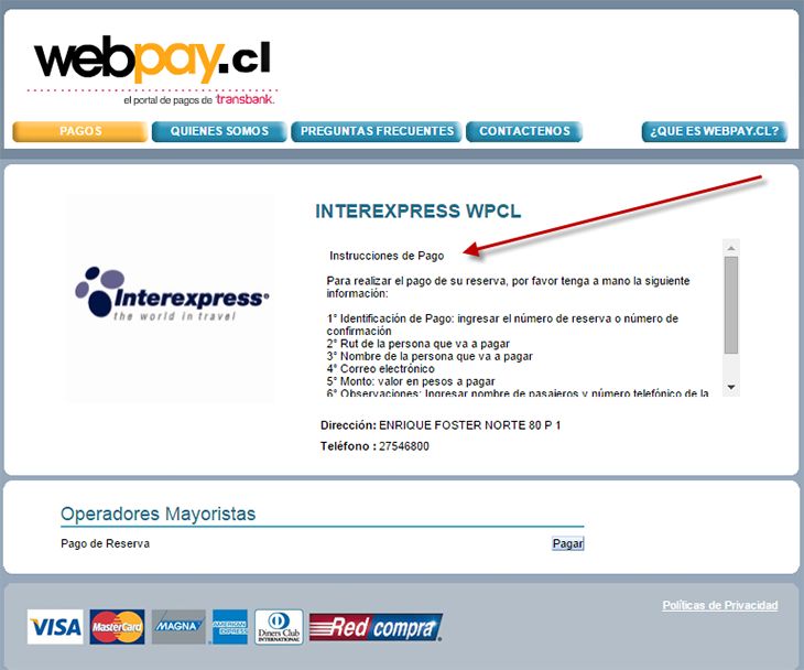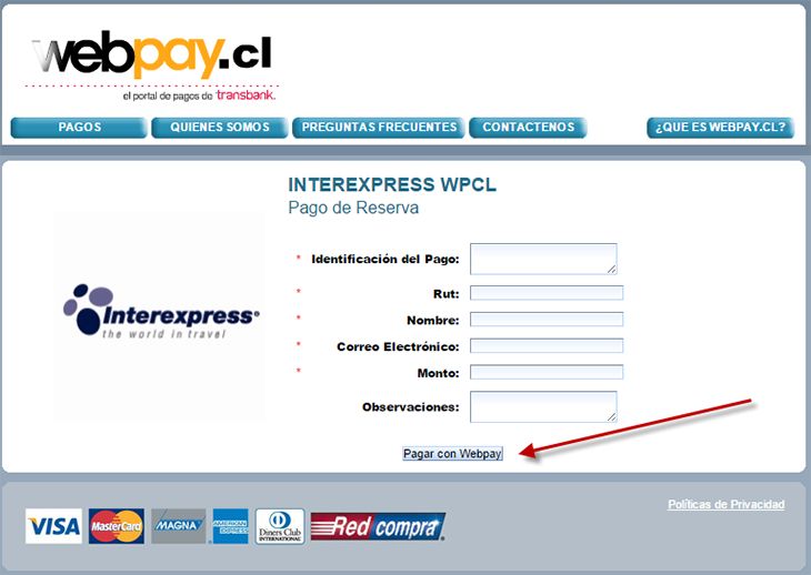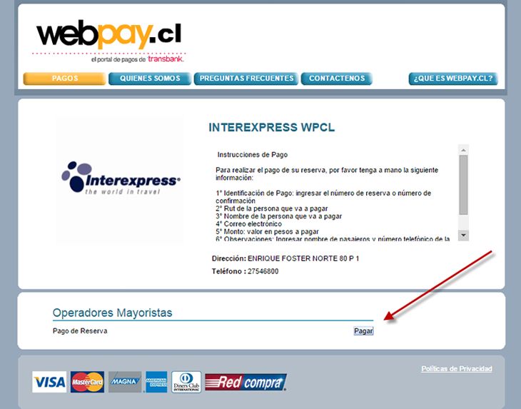 Nota: El pago realizado en Webpay.cl se procesa al siguiente día hábil, por lo que no garantiza la confirmación inmediata de la reserva con la naviera. La reserva se considerará confirmada solo cuando un ejecutivo de Interexpress lo valide formalmente por correo.